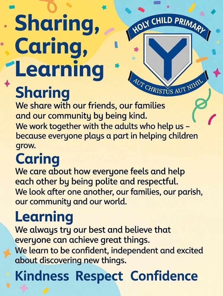 As part of our School Development Plan for 2025–2026, we set out to reflect on and refresh our school vision. While “Sharing, Caring and Learning” has long been a proud and cherished motto at Holy Child, we wanted to ensure that our vision truly captures who we are today — and what we aim to offer every family who becomes part of our school community.