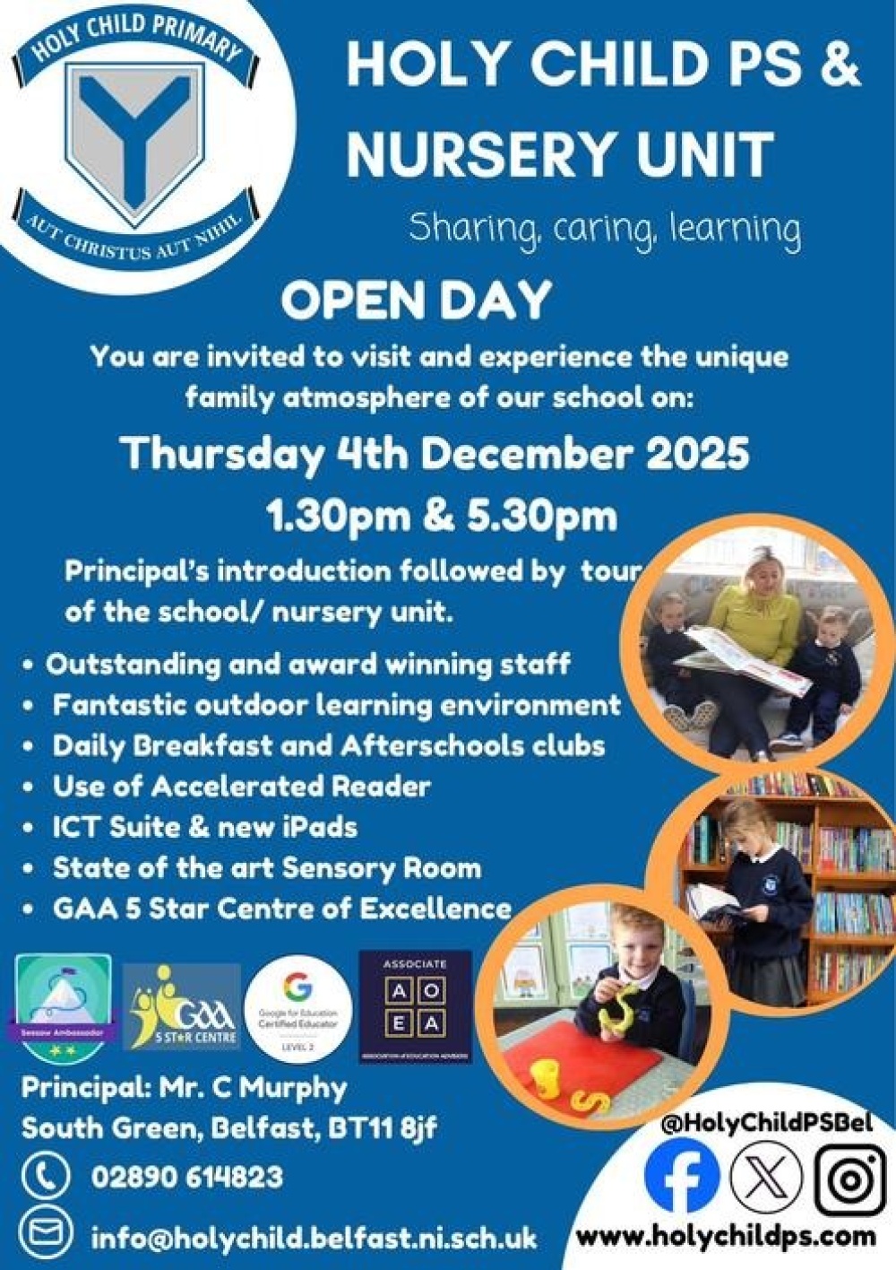 Come along to our Open Day/Evening on the 4th December. Parents and pupils are invited. We have two slots 1:30pm and 5:30pm, which will start with an introduction from the principal followed by a tour of the nursery unit/classes. Please come and visit our school.